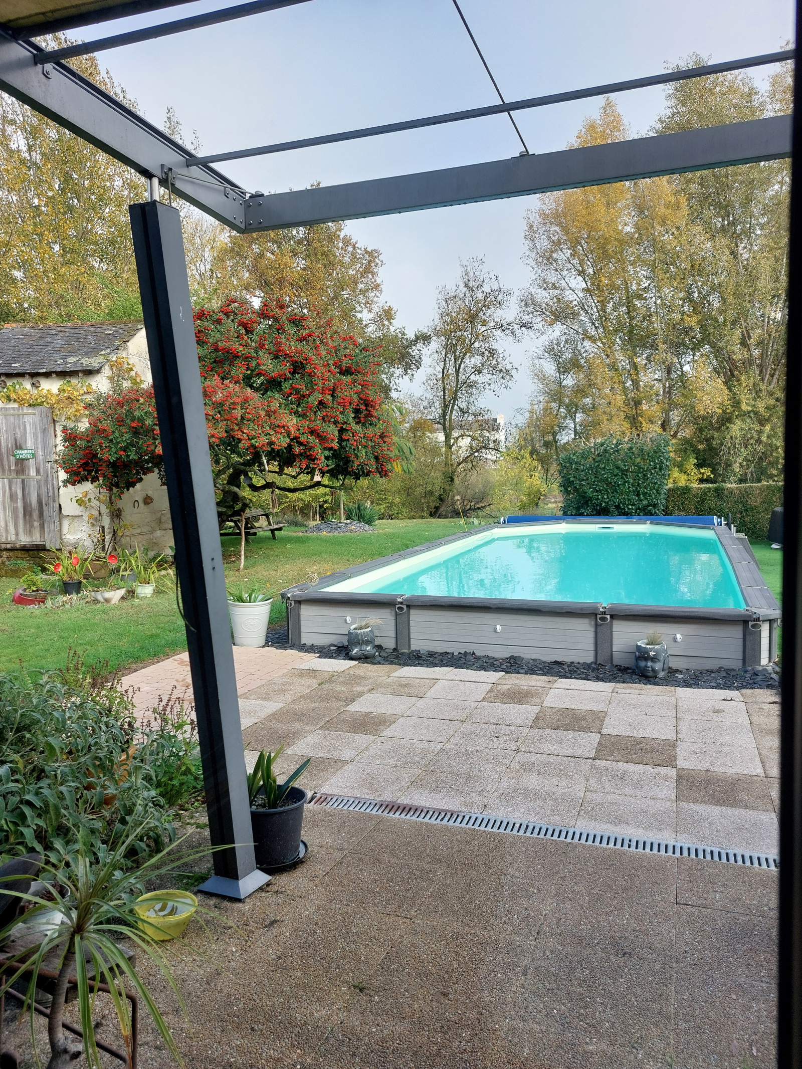 Dépendances dont un ancien séchoir à chanvre et une terrasse semi- couverte pour les petits déjeuners d'été, box à chevaux, abris de jardin, piscine semi- enterrée avec vue sur l'eau, four à pain, garage et parking à l'avant.Système de pompe à chaleur récent et fosses.
